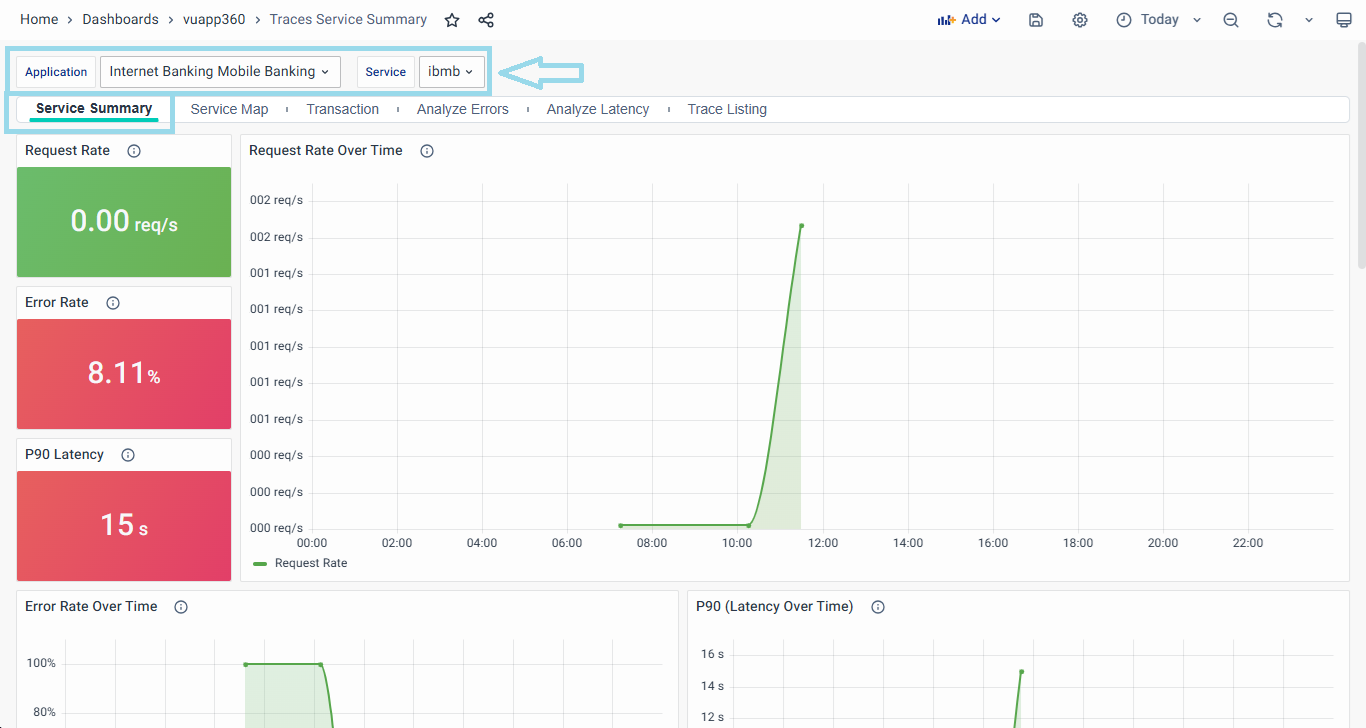 - Service Summary Dashboard: By clicking on a specific service, users are seamlessly redirected to the dedicated service summary dashboard. This feature enables you to drill down into individual service details, providing a more in-depth analysis of its performance. The details of the Service Summary dashboard are discussed in further sections.