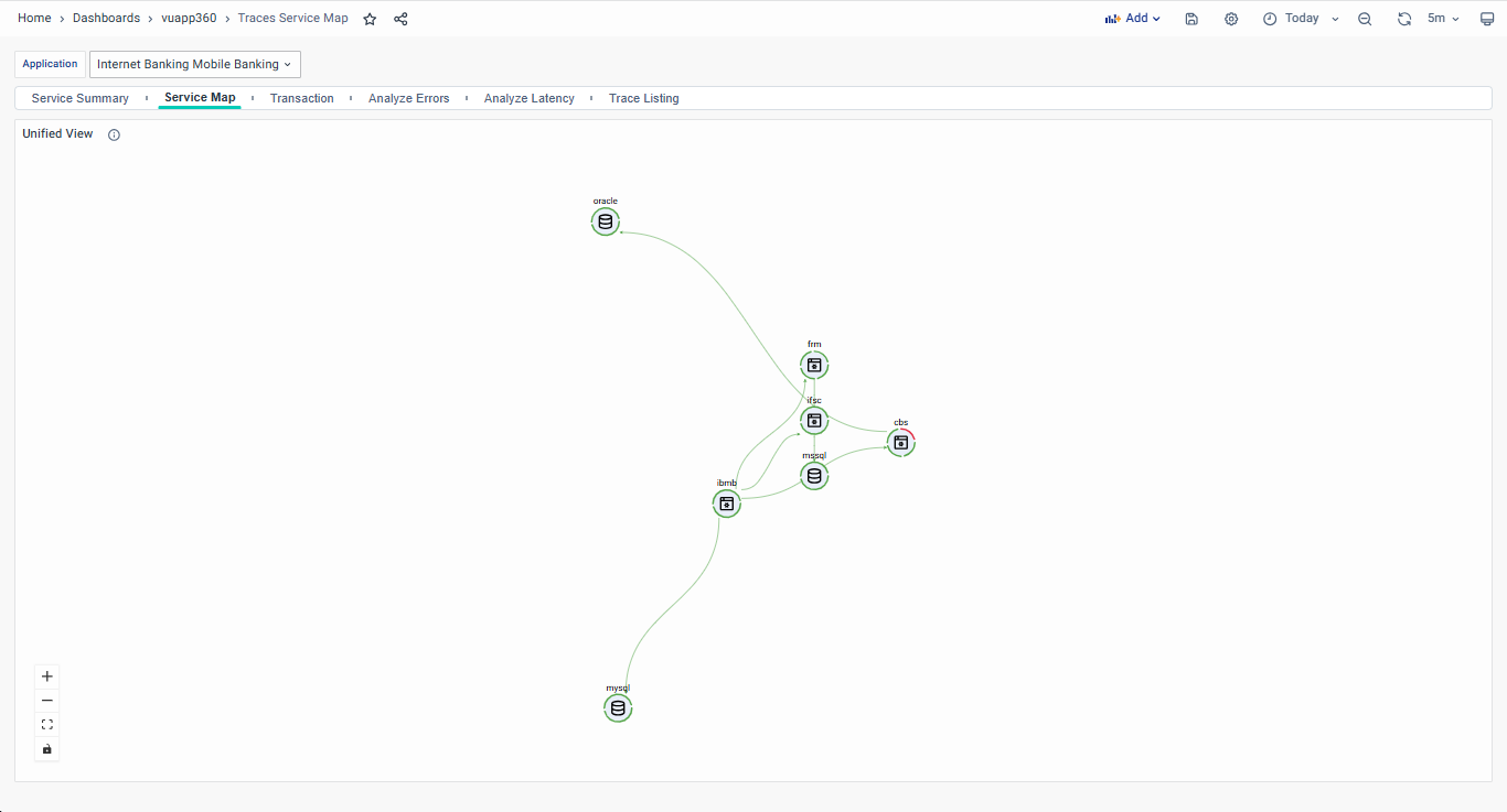 The Graphical View introduces an interactive Service Map, visually representing how various services interact with each other for a particular application. This graphical representation helps you understand service dependencies and interactions. The Service Map includes the following features:
