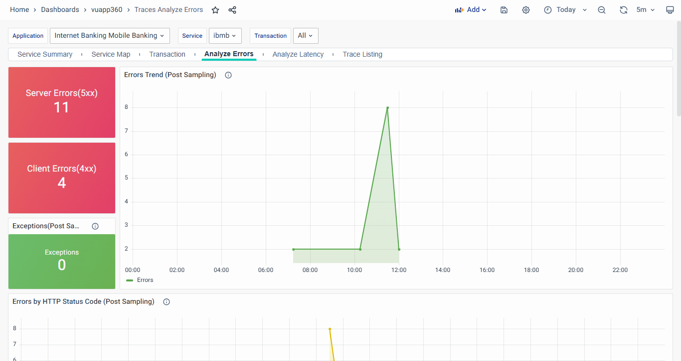 - Errors by HTTP Status Code: This chart displays the trend of failed transactions over time, categorized by HTTP status codes. It helps users track error occurrences and analyze failure patterns.
