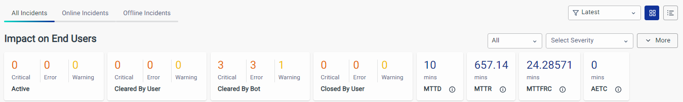 Below is the overview panel, which shows the total number of active incidents, incidents cleared by users & Bot, and incidents closed by the users for the selected time window.