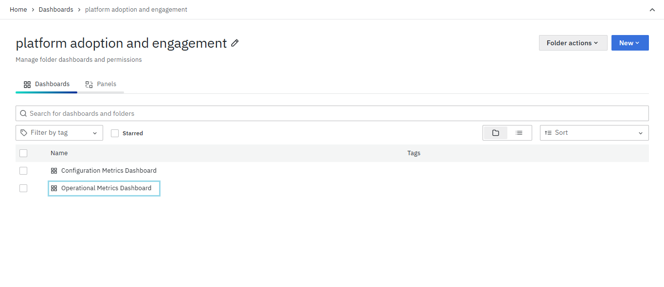 - In the search bar, type Platform adoption and engagement, open the folder, and then click on Operational Metrics Dashboard.