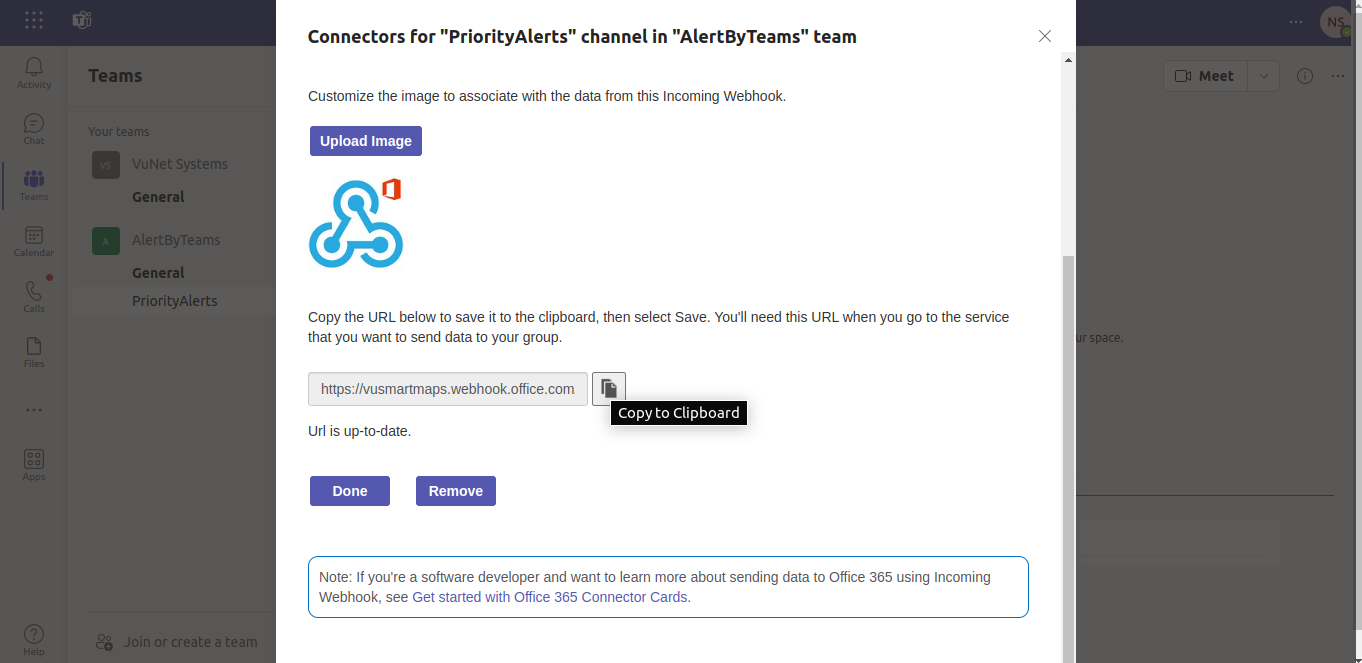- Copy the generated webhook URL to your clipboard. This URL is unique to your webhook and is used to send messages to the Teams channel.