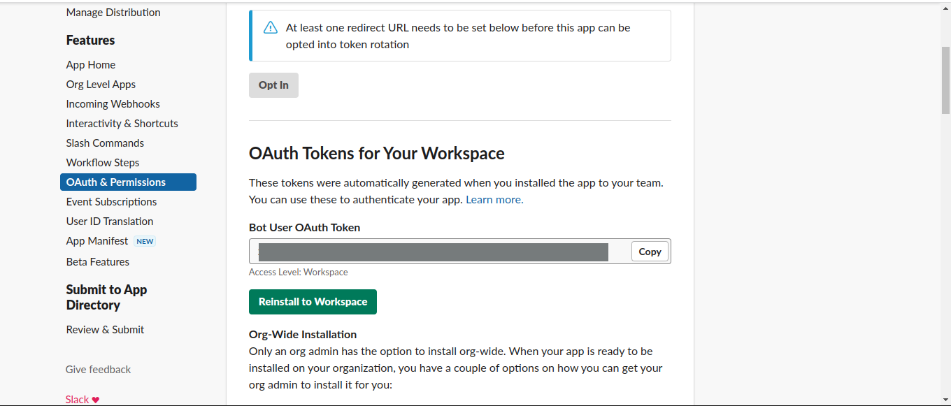- Generate a Bot user token by logging into the created app and navigating to the Features -> OAuth & Permissions section.
