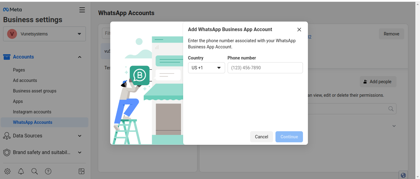 - Select Your WhatsApp Business API Instance: If you have multiple instances, select the instance for which you want to add a phone number. (https://business.facebook.com/settings/whatsapp-business-accounts/ )
