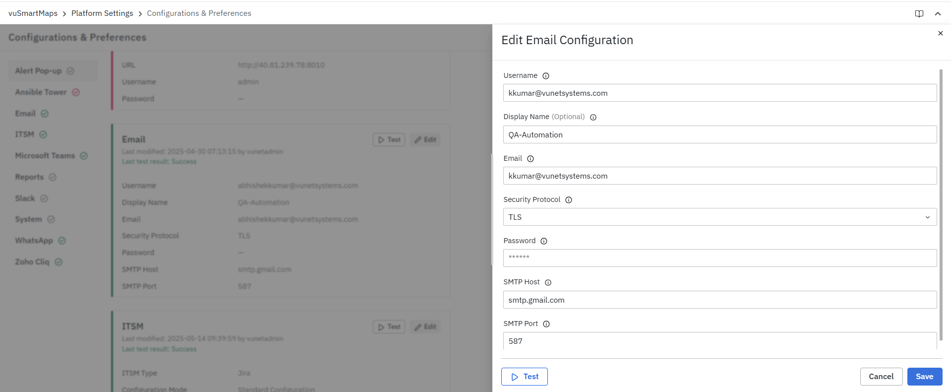 Click the Test button to send a test email to a specified email address. Enter the recipient email ID in the prompted modal. A success message confirms delivery, while a failure message provides error details for resolution.