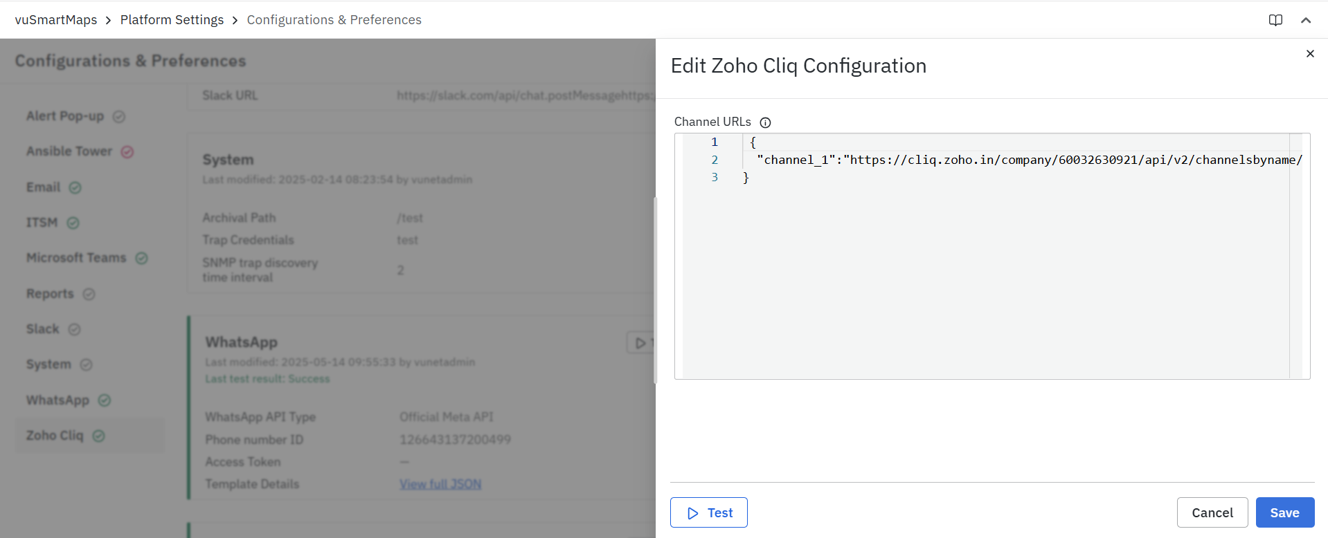 Alerts from the platform can be sent to various notification channels, including Zoho Cliq. When a webhook token is generated for a channel, the URL, along with the webhook token, is added in the Configurations section as a JSON object. The channel name serves as the key, and the URL with the webhook token is the corresponding value.