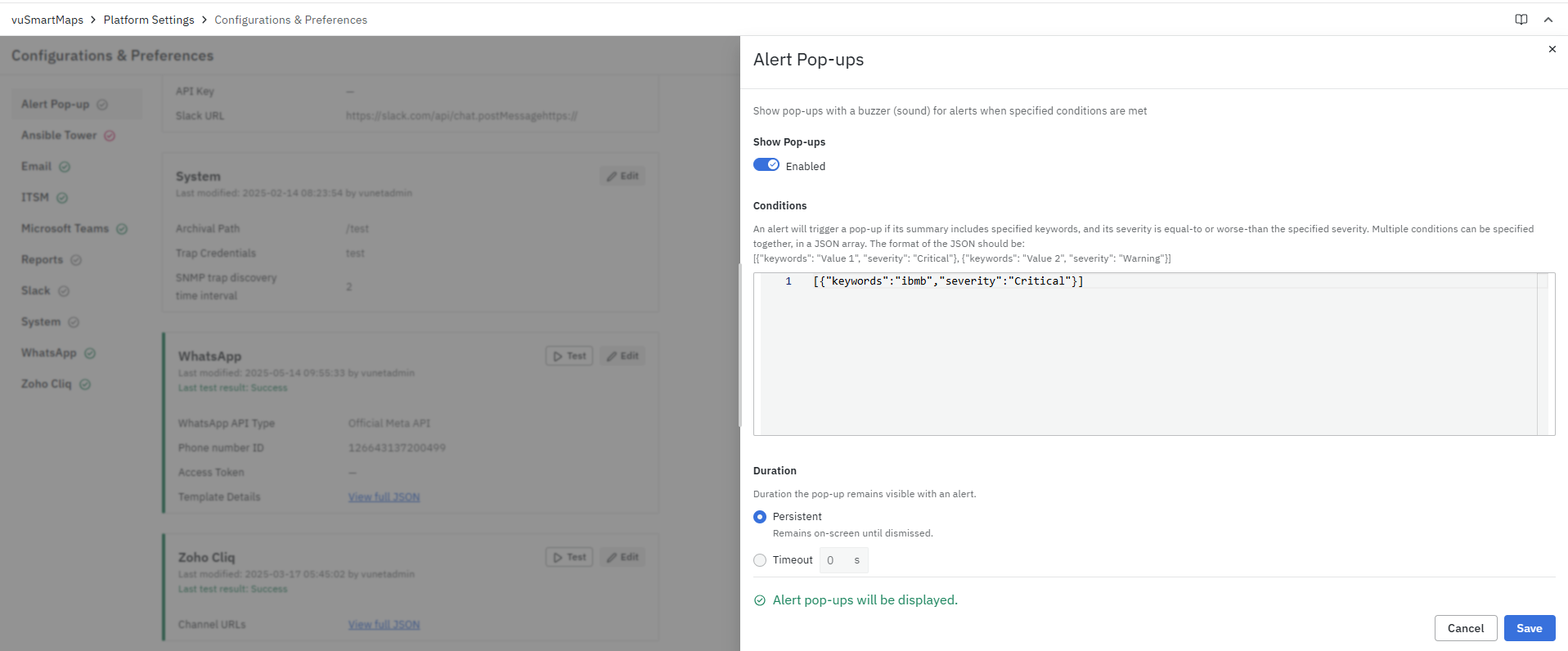 Go to Alert Popup Configuration and enable the “Show Pop-Ups” toggle. Define conditions in JSON format with keywords and severity levels, and choose display duration.