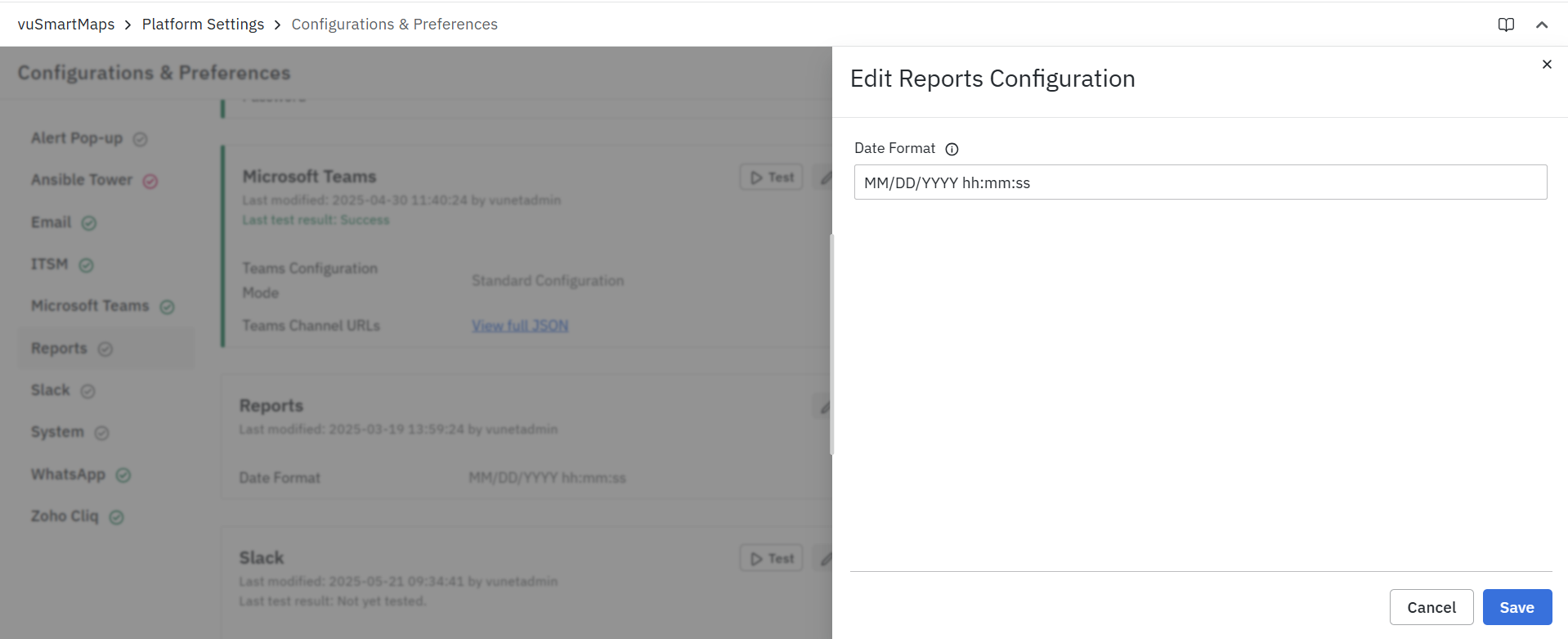 With this configuration, the user can provide the date time format in which the date fields of the report need to be displayed. The default format for this configuration is DD/MM/YYYY hh:mm:ss