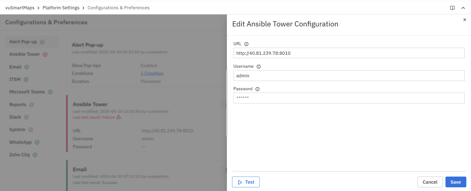 - Navigate to the Ansible Tower Configurations section on the Configurations & Preferences landing page. The Configurations can be configured in the modal by clicking on the Edit button.