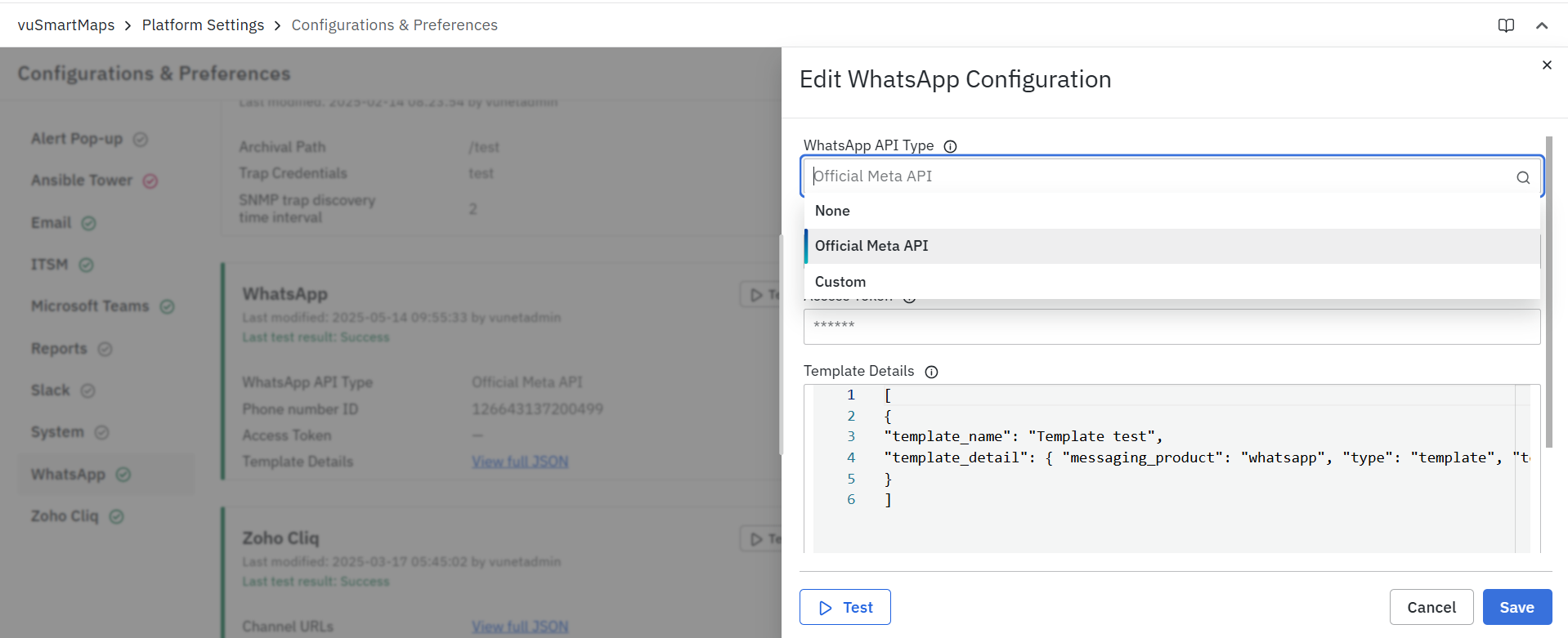 The platform supports WhatsApp integration for sending alerts and notifications. Users can configure WhatsApp as a notification channel to ensure timely updates. They can choose between two configuration methods: