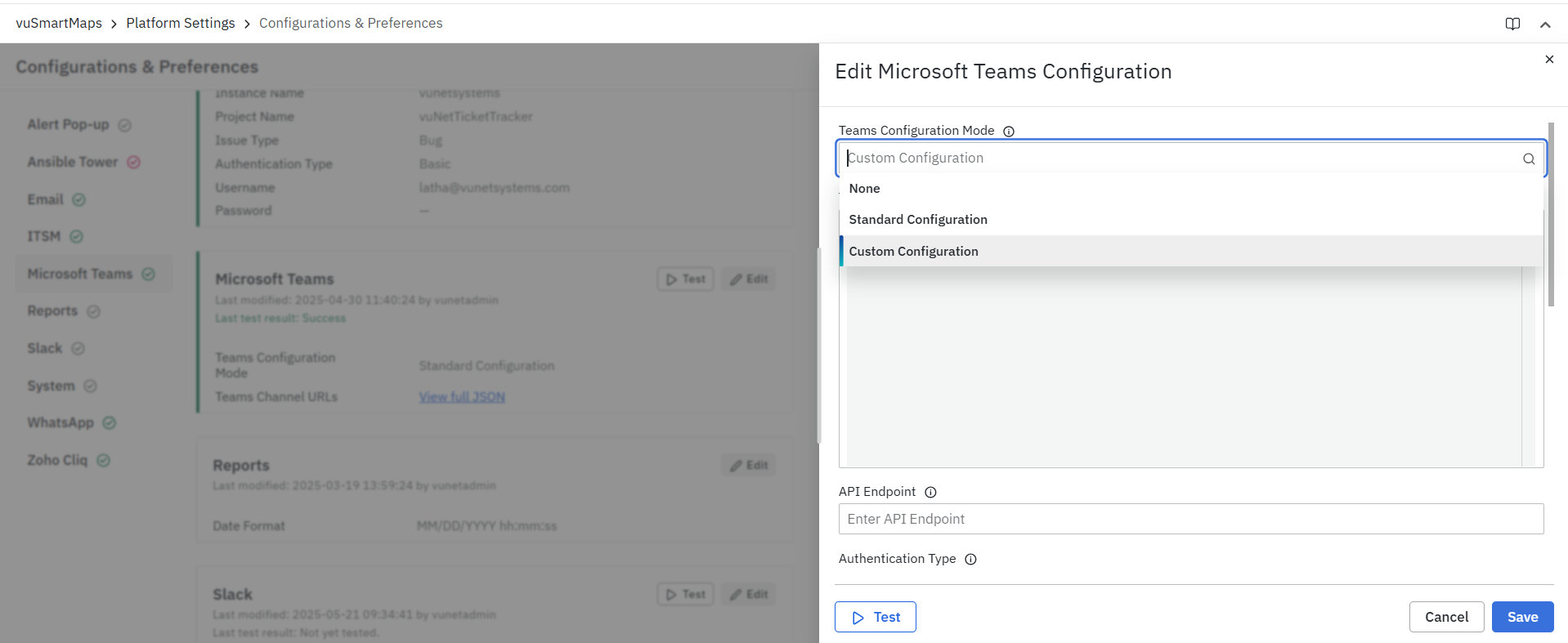 The vuSmartMaps platform allows users to configure MS Teams integration for alert processing. This section outlines the different configuration methods, authentication types, and advanced customization options available.
