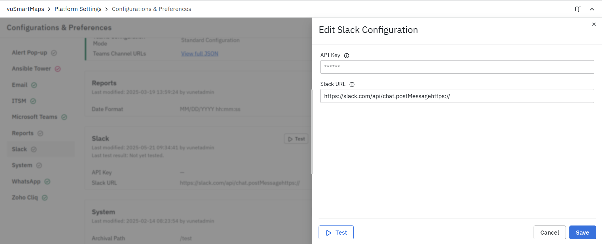 Click Test and enter a Slack channel name. The system sends a test message. Successful tests confirm message delivery, while failures display errors for invalid API keys or channel names.