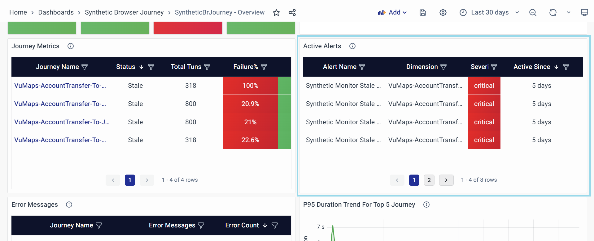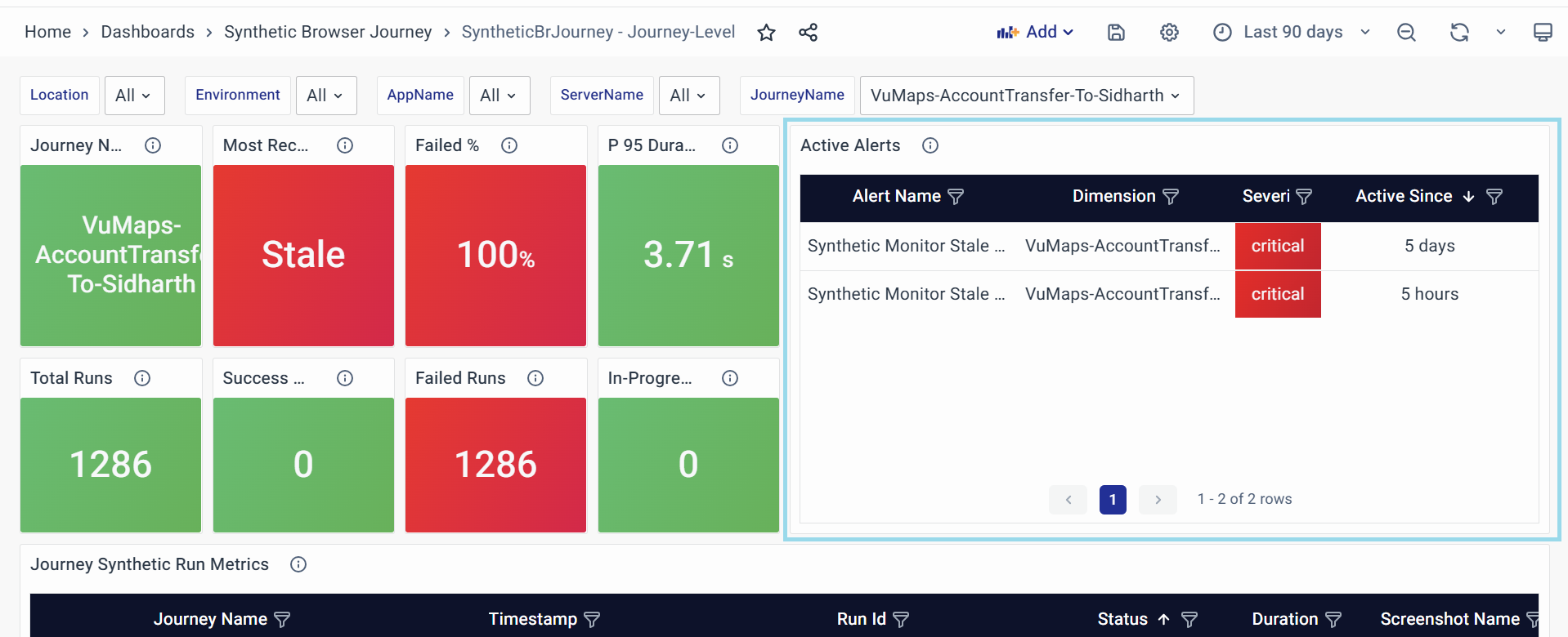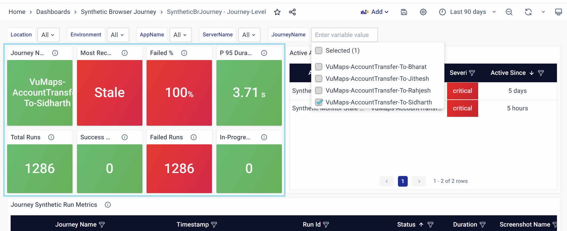 2. SyntheticBrJourney - Journey-Level Dashboard: The Synthetic Browser Journey - Journey-Level Dashboard provides a real-time overview of workflow performance, tracking status, failure rates, run times, and active alerts while offering detailed logs, screenshots, and visual trends to prioritize and address issues quickly.