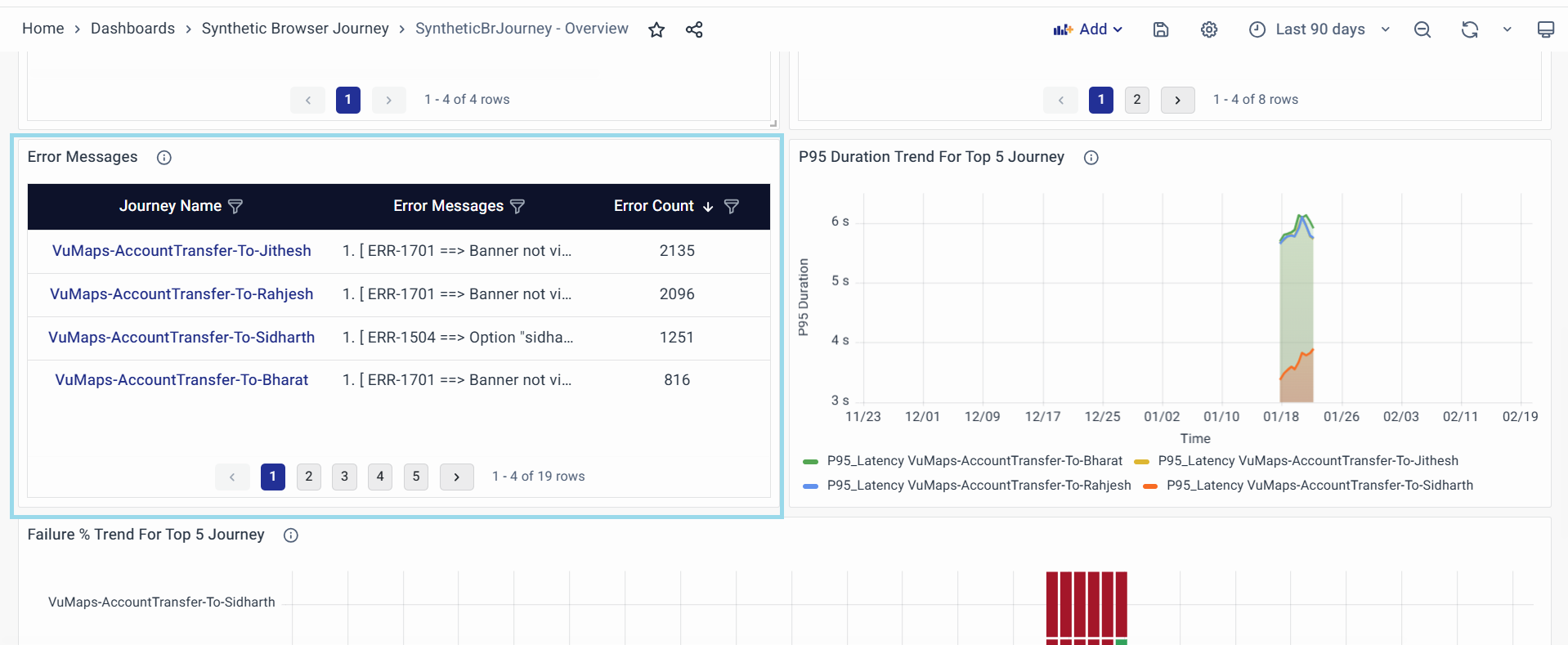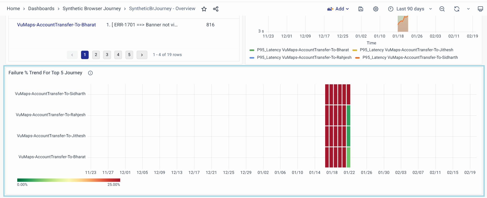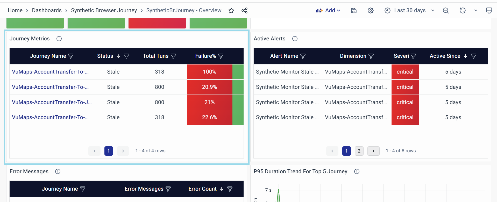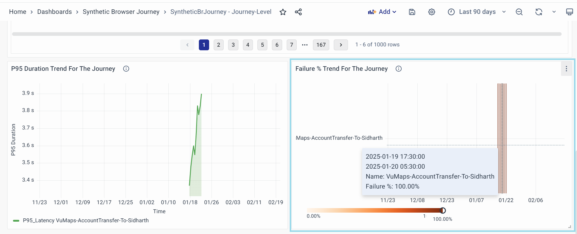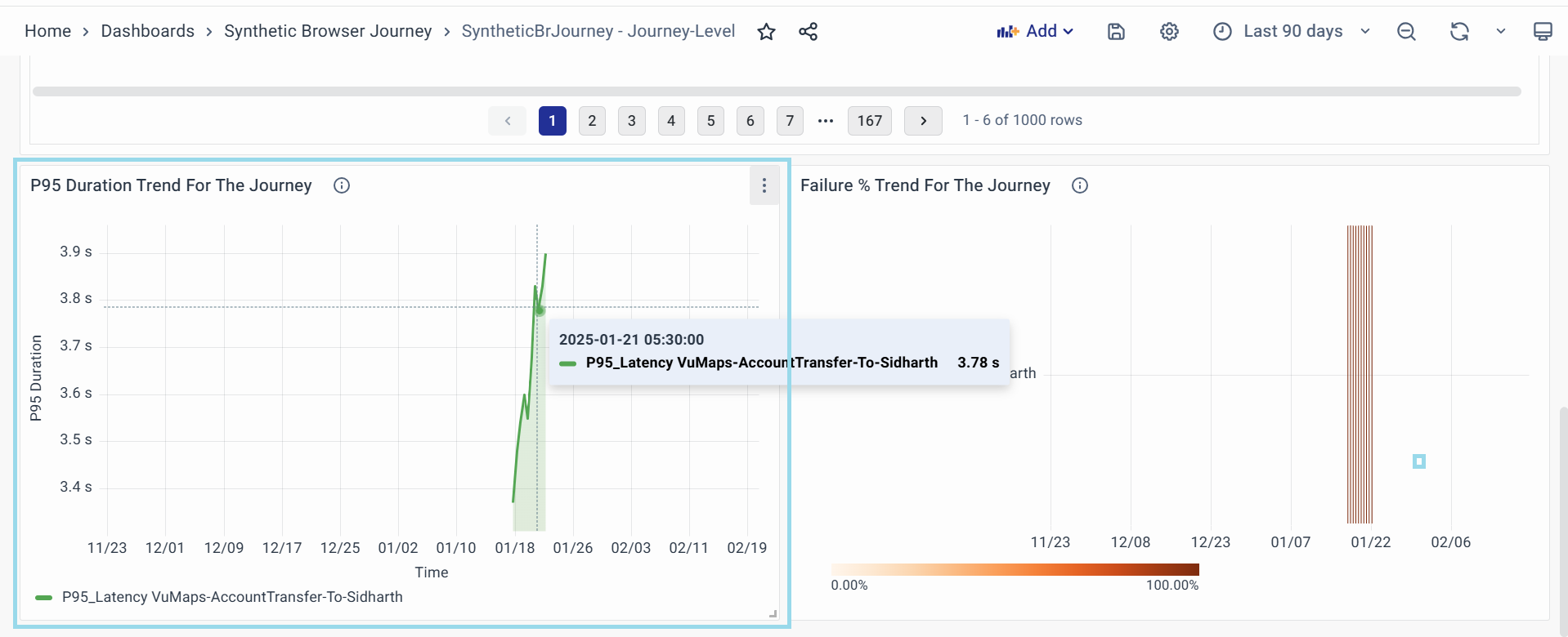 • Actions: Click on a journey name to access the Synthetic Browser Journey - Journey-Level Dashboard for detailed insights.