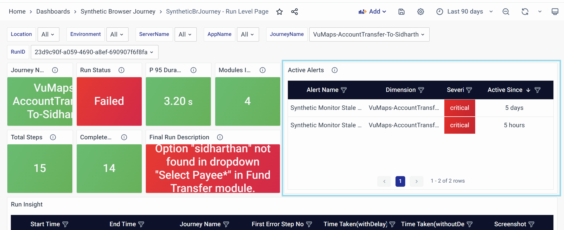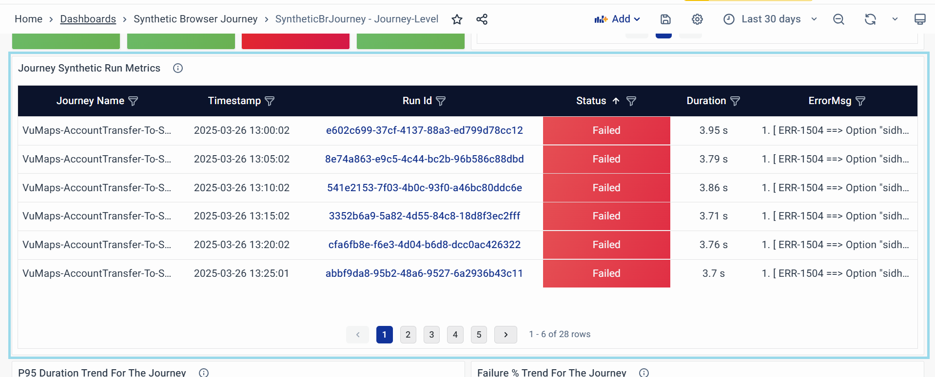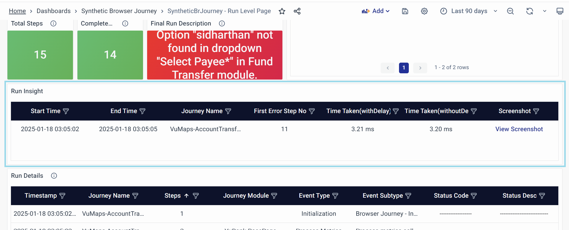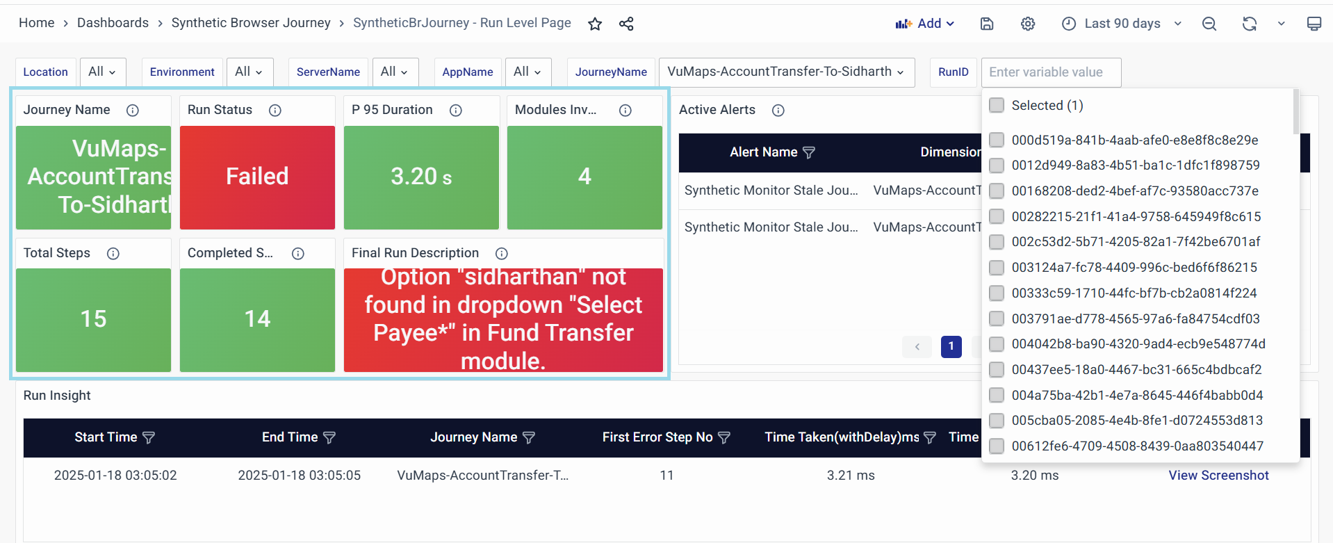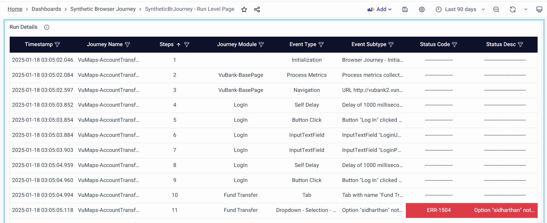 3. SyntheticBrJourney - Run Level Dashboard: The Synthetic Browser Journey - Run Level Page dashboard provides a detailed, step-by-step breakdown of test runs, showing run status, execution time, failed steps, and the cause of failures, along with screenshots and logs for quick troubleshooting and issue resolution.