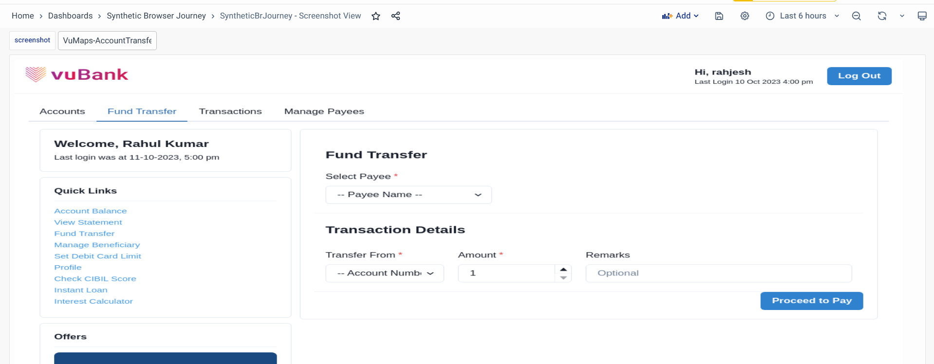 4. Synthetic Browser Journey - Screenshot view Dashboard: The Synthetic Browser Journey - Screenshot view Dashboard displays images from each test step to visually confirm errors, UI behavior, and performance issues.