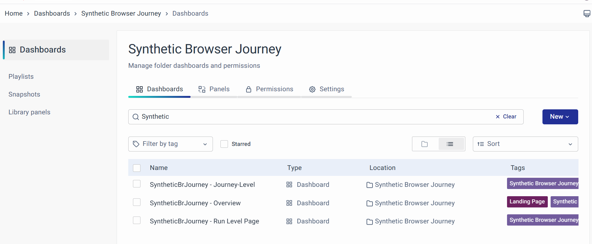 Synthetic Browser Journey Monitoring Dashboards, pre-packaged with Synthetic Browser Journey Monitoring, can be accessed by navigating to the Dashboards UI from the left navigation menu, Dashboards. On the Dashboards landing page, SyntheticBrJourney - Overview can be accessed with the help of the Search bar. The SyntheticBrJourney - Overview dashboard is stored under the Synthetic Browser Journey folder.