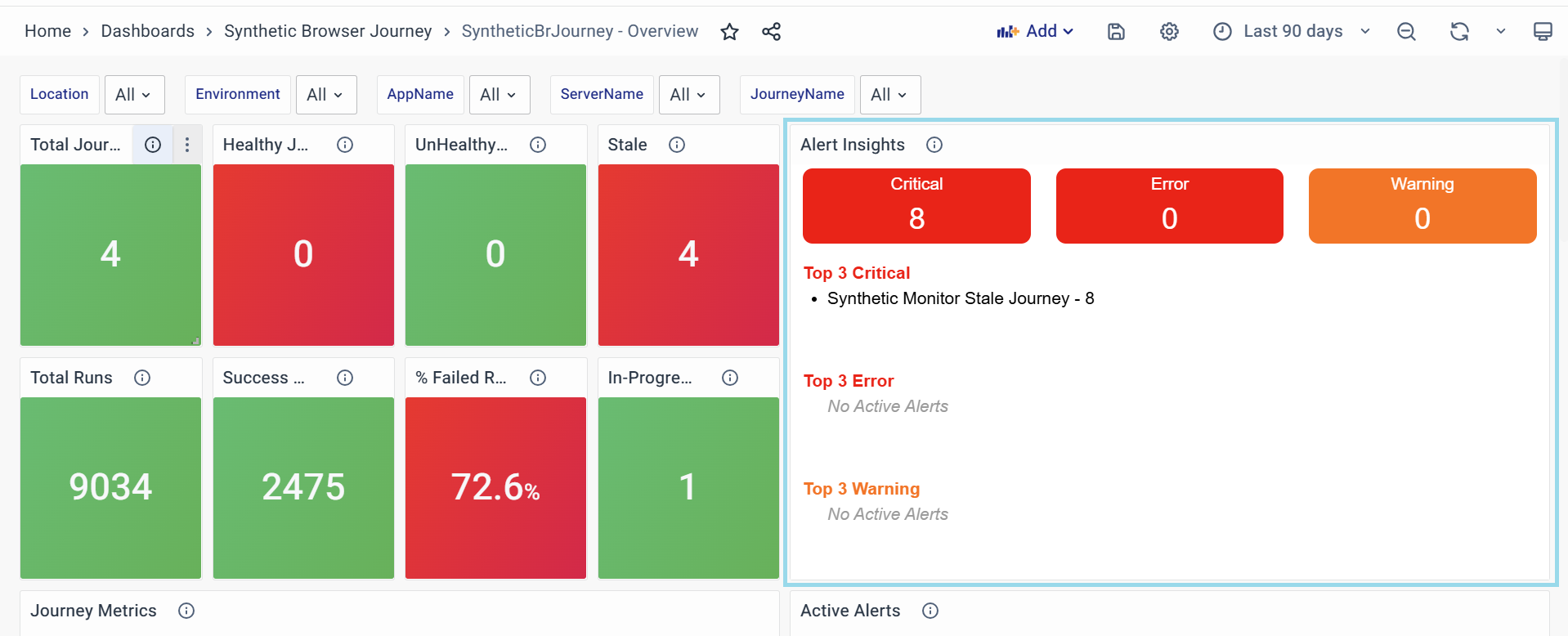 1. SyntheticBrJourney - Overview Dashboard: The Synthetic Browser Journey Overview Dashboard offers a comprehensive overview of journey metrics, health statuses, execution stats, real-time alerts, and performance data to monitor, troubleshoot, and optimize browser-based workflows.