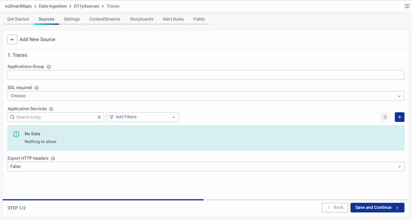 - vuSmartMaps O11ySources can be accessed by navigating from the left navigation menu (Data Ingestion > O11ySources).