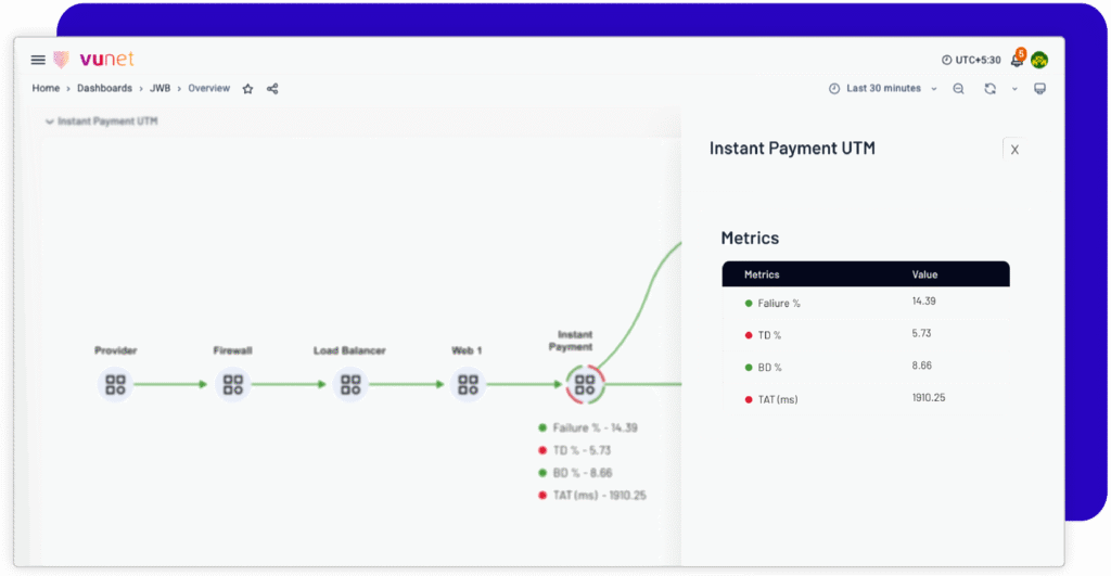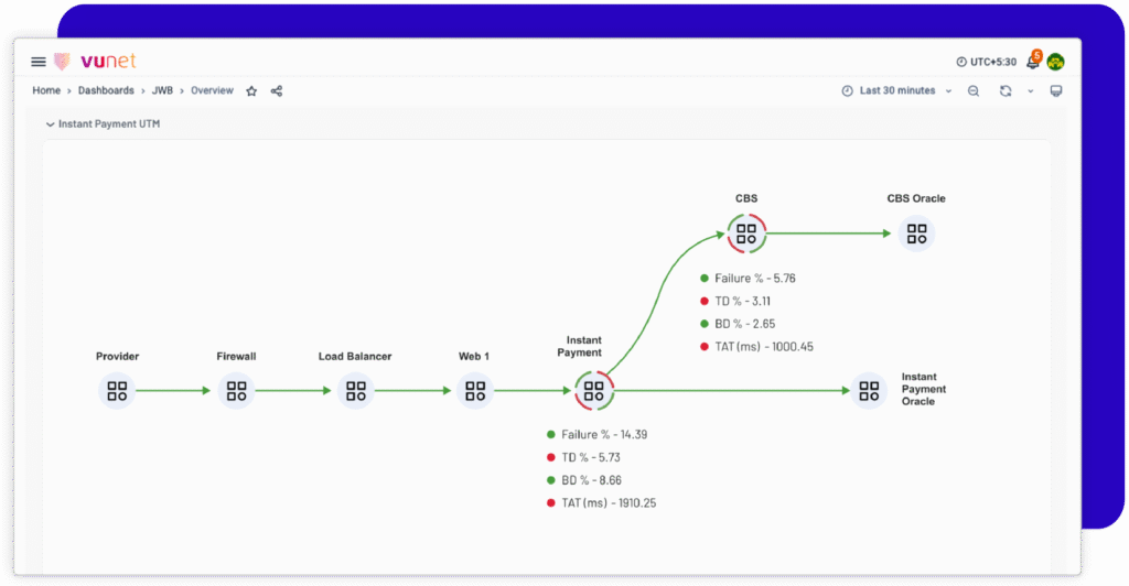 VuNet’s Business-Centric Observability platform, vuSmartMaps™ seamlessly links IT performance to business metrics and business journey performance. It empowers SRE and IT Ops teams to improve service success rates and transaction response times, while simultaneously providing business teams with critical, real-time insights. This enables faster incident detection and response.