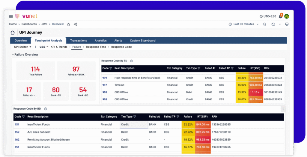 Key journeys like UPI, NEFT, loan onboarding, or card issuance span multiple systems lacking complete visibility