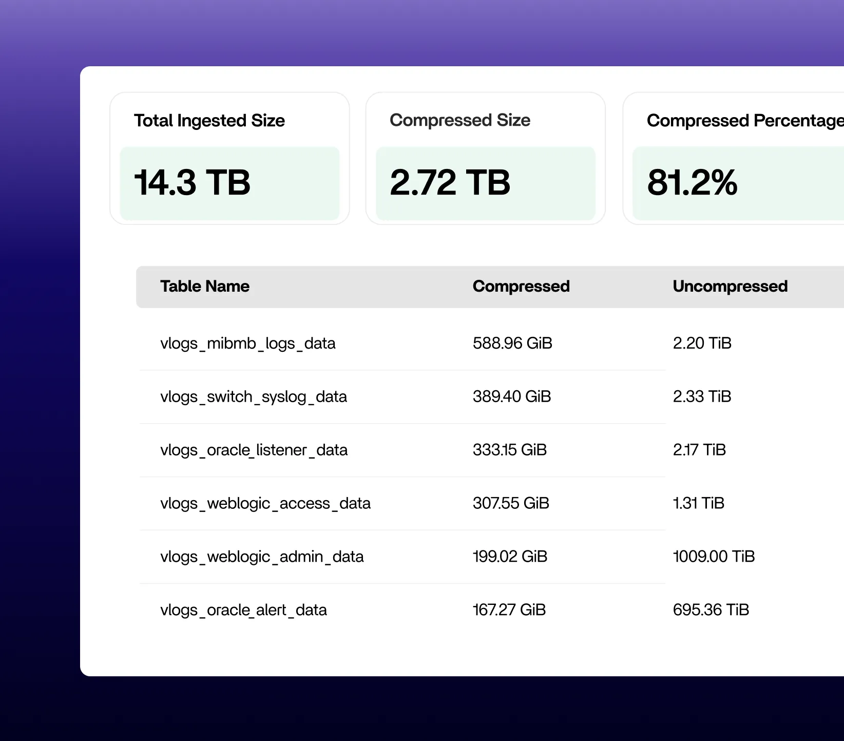 Compression-first, columnar database architecture delivers massive 75–80% data compression using ZSTD — cutting storage, compute, and disk I/O costs while keeping retrieval fast, even at scale.