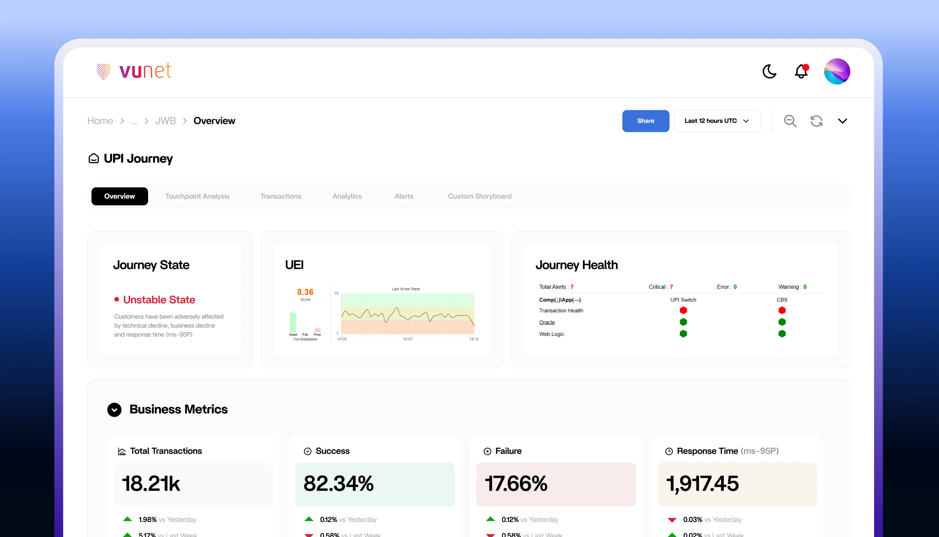 - Monitor every UPI transaction from initiation through settlement with real-time visibility into latency, error rates, throughput, and success rates across all hops—customer app, PSP, regulator switch, beneficiary bank.