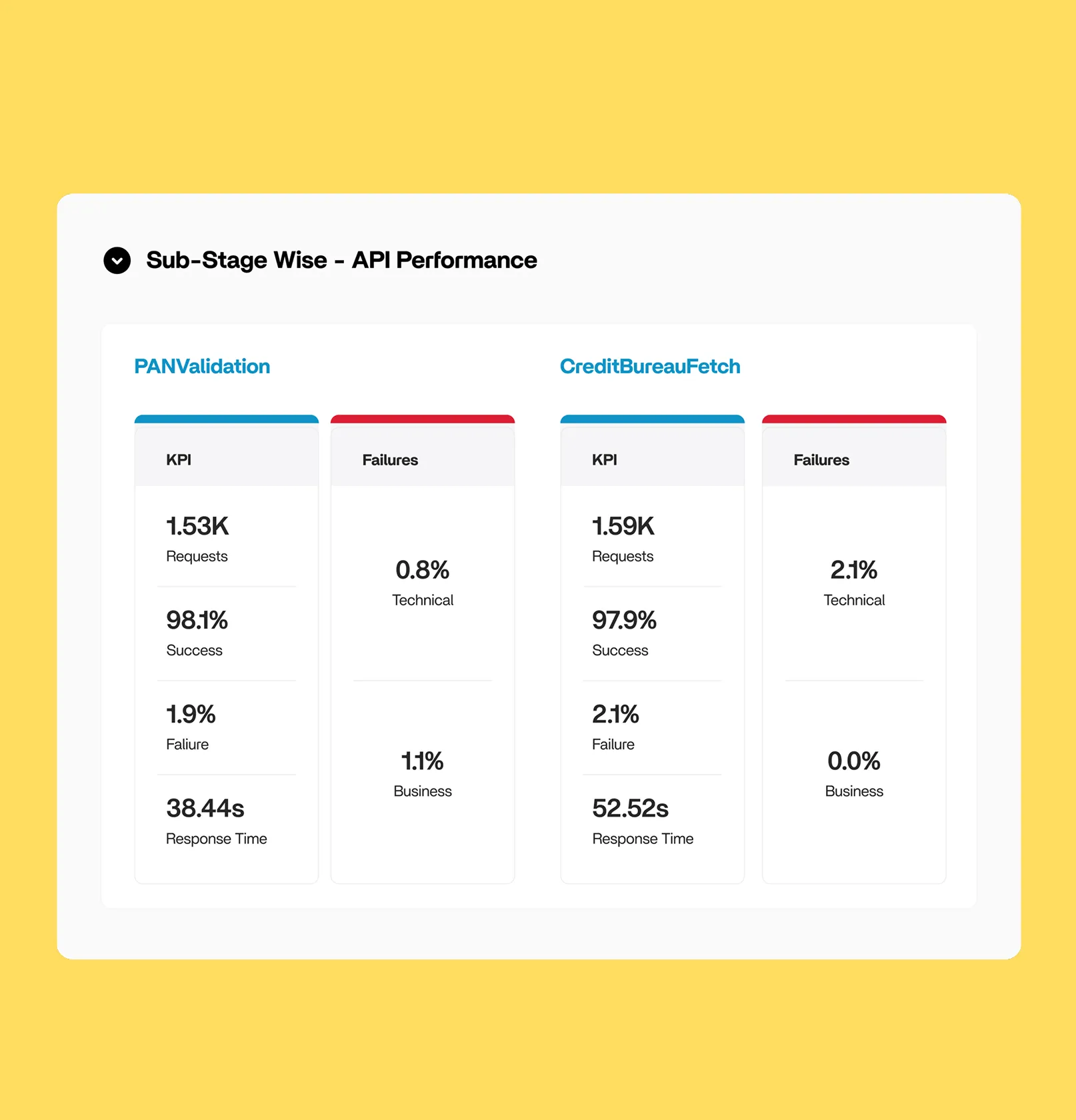 - Third-party verification API performance (Aadhaar, PAN, bank statements)