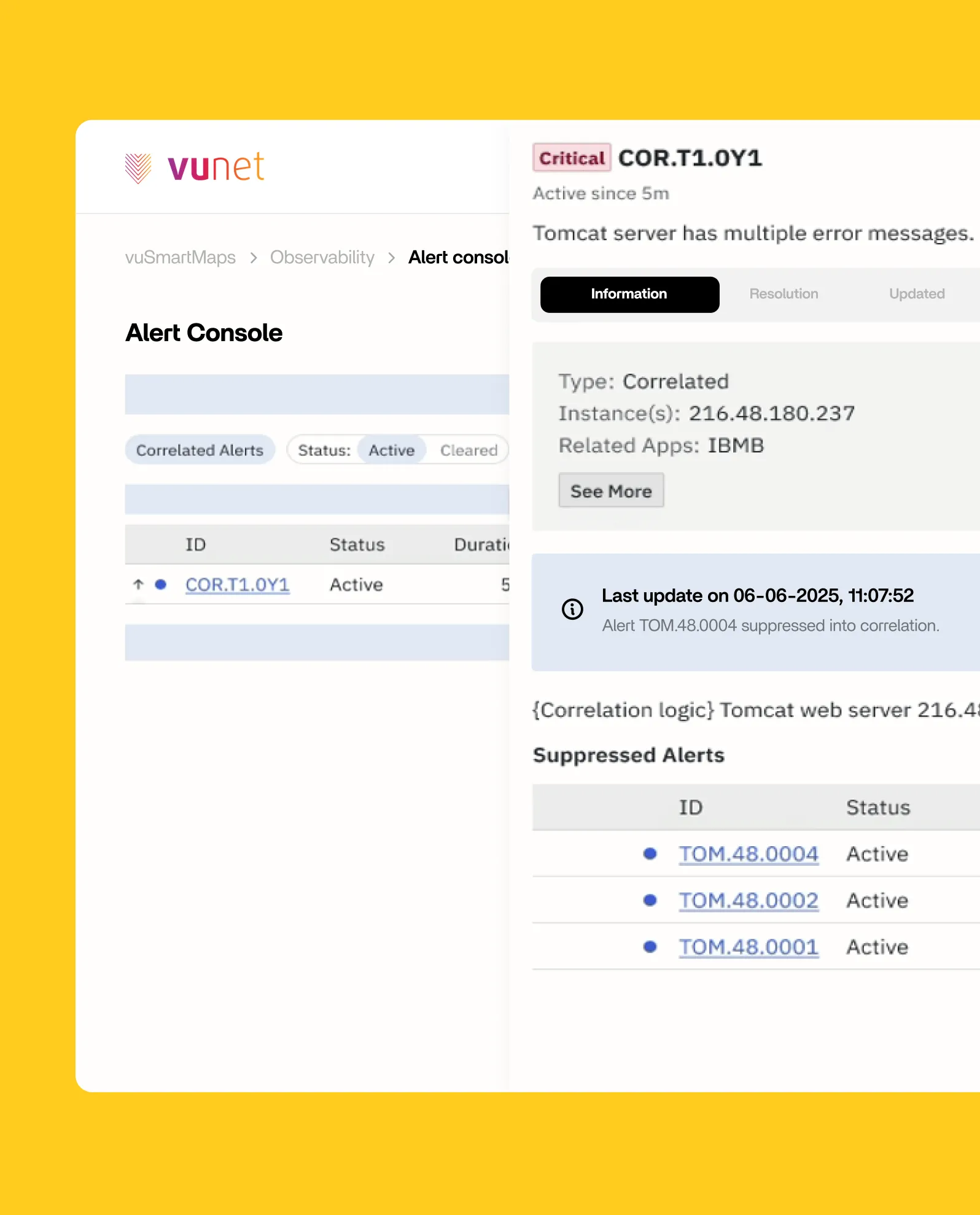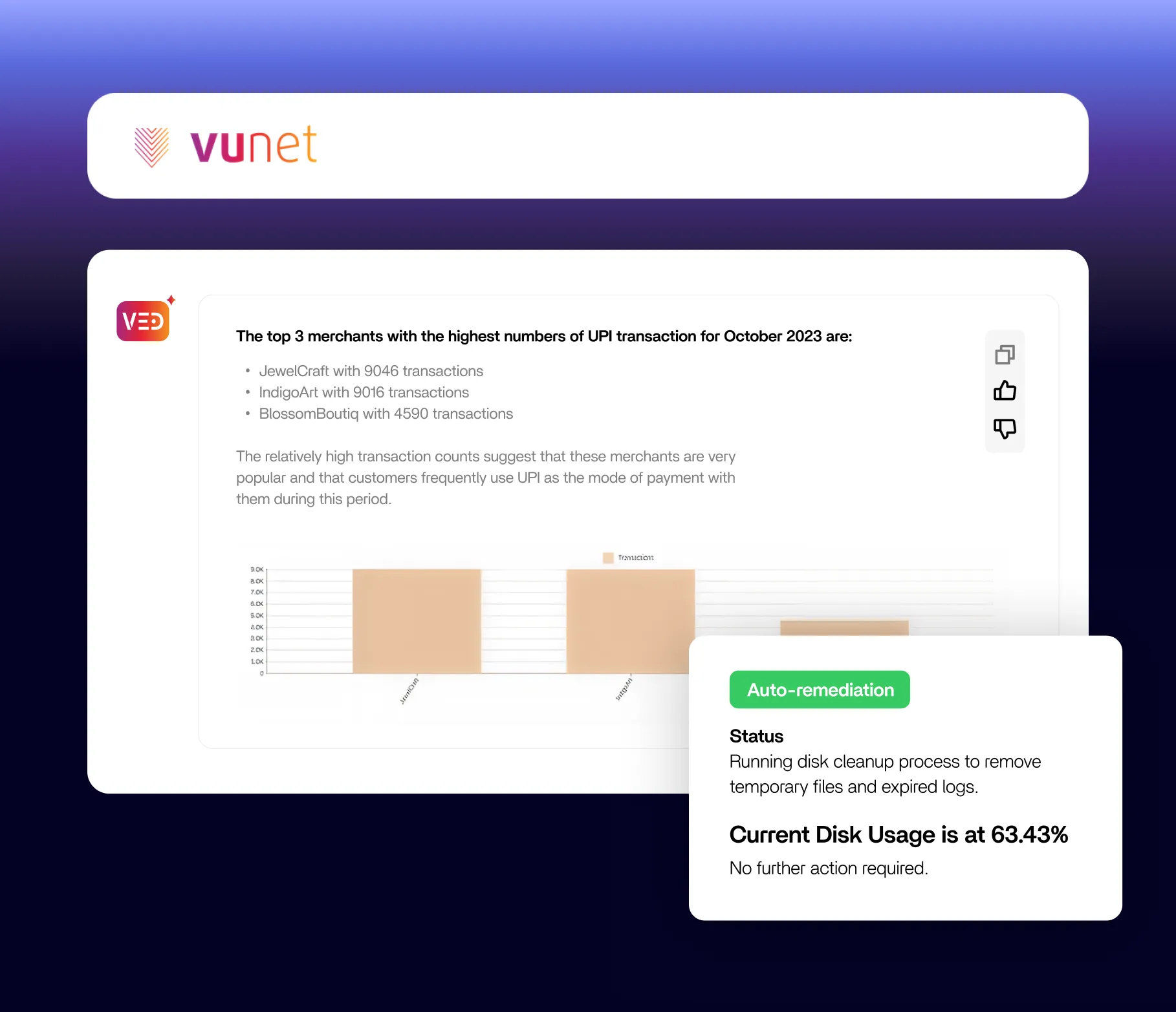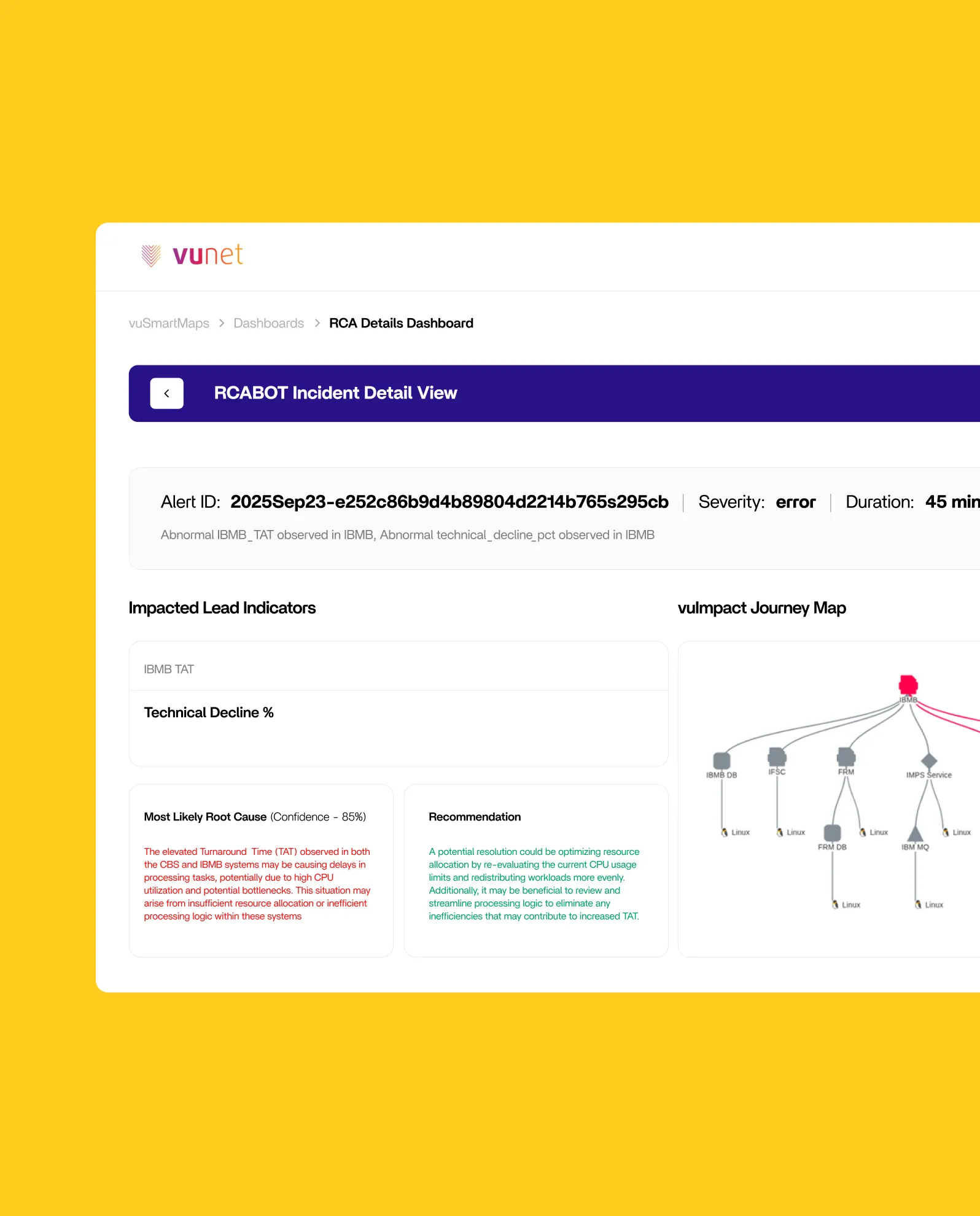 VuNet’s AI/ML engine, vuCoreML, designed for enterprise-scale, transaction-heavy environments, detects issues early, explains why they happen and helps fix them fast before they affect your customers.