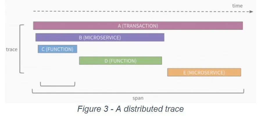 Distributed tracing is the collection of data related to end-to-end requests within an application. A trace is made up of one or more spans where a span represents a call within the request. A call may be a microservice or a function within a microservice. The general structure of a trace looks like the following (Figure 3):
