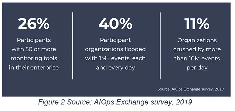 AIOps Exchange, a not-for-profit private forum, held a survey across 100 IT executives representing large enterprise organizations as well as IT industry analysts and academics. Industries that were represented include financial services, transportation, technology, education, and healthcare. AIOps Exchange’s participant survey revealed that, 26% participants deal with 50 or more monitoring tools in their enterprise, while 40% organizations are flooded with 1 million plus events every day (Figure 2).