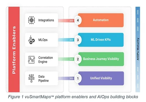 In one of our earlier blogs, we discussed the need for addressing the challenges of digitization through a journey-based AIOps platform (such as vuSmartMaps™ platform illustrated in Figure 1). vuSmartMaps™ as a full stack AIOps product brings together its platform enablers – Data pipeline for Unified Visibility, Correlation Engine for Unified Visibility, MLOps for ML Driven KPIs, and Integration for Automation to enable organizations reach AIOps maturity goals. We demystified the platform enablers as the fundamental building block of your AIOps solution. We discussed the need for unified visibility and reasoned the need for correlation of your business transactions across distributed systems is key for business and customer journey visibility.