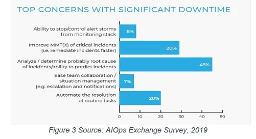 The survey also captured the key concerns of the organizations with downtime, as shown in Figure 3. About 45% of their concerns are their inability to root-cause the incidents or predict the incidents. About 20% of the concerns are their inability to remediate the incidents faster and 20% of concerns are lack of automating the resolution of routine tasks.